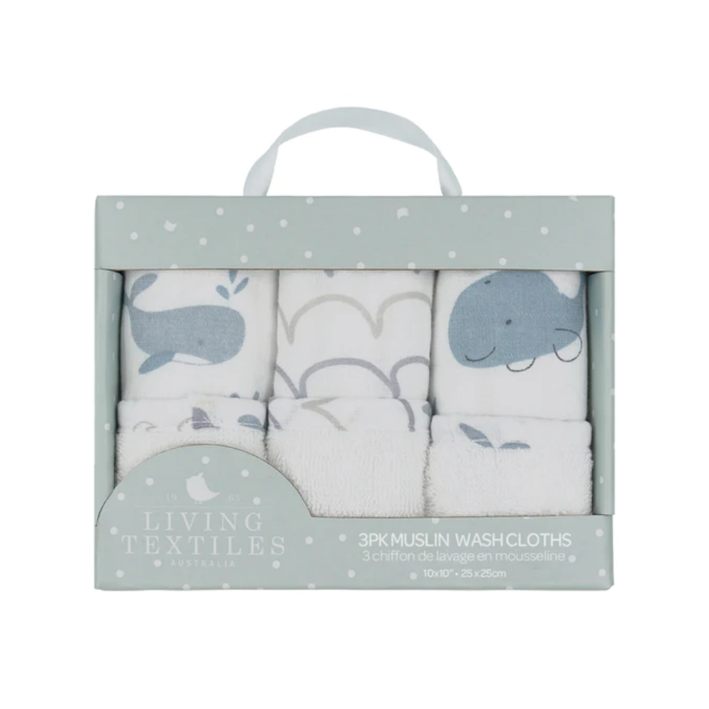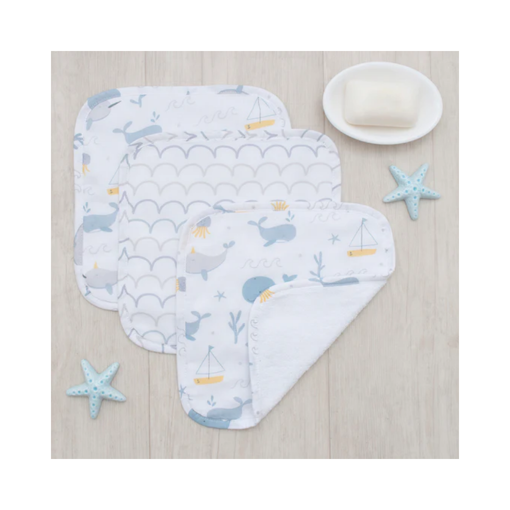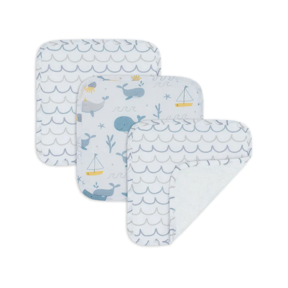 - Las toallitas de algodón para bebé Whale of a Time cuentan con encantadores estampados de ballenas en sutiles tonos verde azulado y gris.