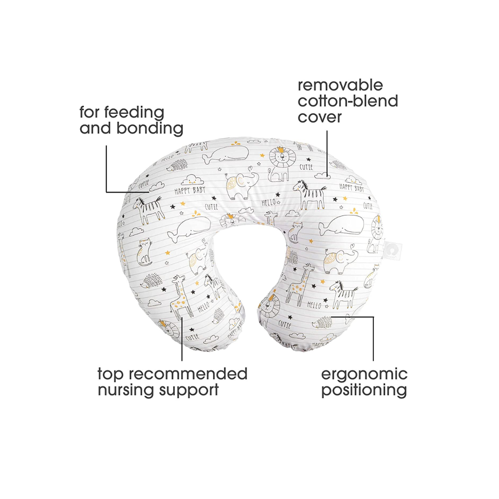 - La almohada de apoyo para bebés y alimentación desnuda Boppy Bare lo apoya ergonómicamente mientras amamanta o alimenta con tetero.